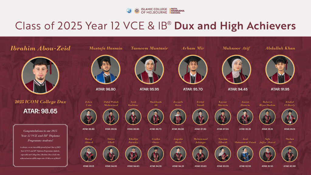 The Islamic College of Melbourne is extremely proud to announce our VCE and IB 2025 High Achievers.